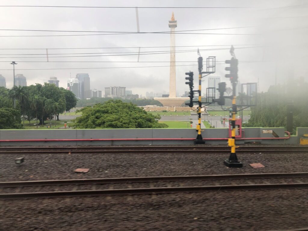 Gambir駅付近を走行中の車内からモナス(Monumen Nasional)が見えます。モナス(Monumen Nasional/国家記念塔)は、ジャカルタの中心、メルデカ広場にそびえ立つ、インドネシア独立を記念して建てられた高さ132メートルの記念塔です。1961年に建設が始まり、1975年に一般公開されました。塔の頂上には「永遠の炎」を象徴する金箔(約35kg分)が飾られており、インドネシアの独立の精神を表しています。展望台からはジャカルタ市内を一望でき、天気の良い日には遠くの海まで見渡すこともできます。塔の内部には独立の歴史を紹介する博物館があり、インドネシア建国の歩みを映像や展示で学ぶことができます。夜にはライトアップされ、昼間とは違った幻想的な雰囲気に包まれます。