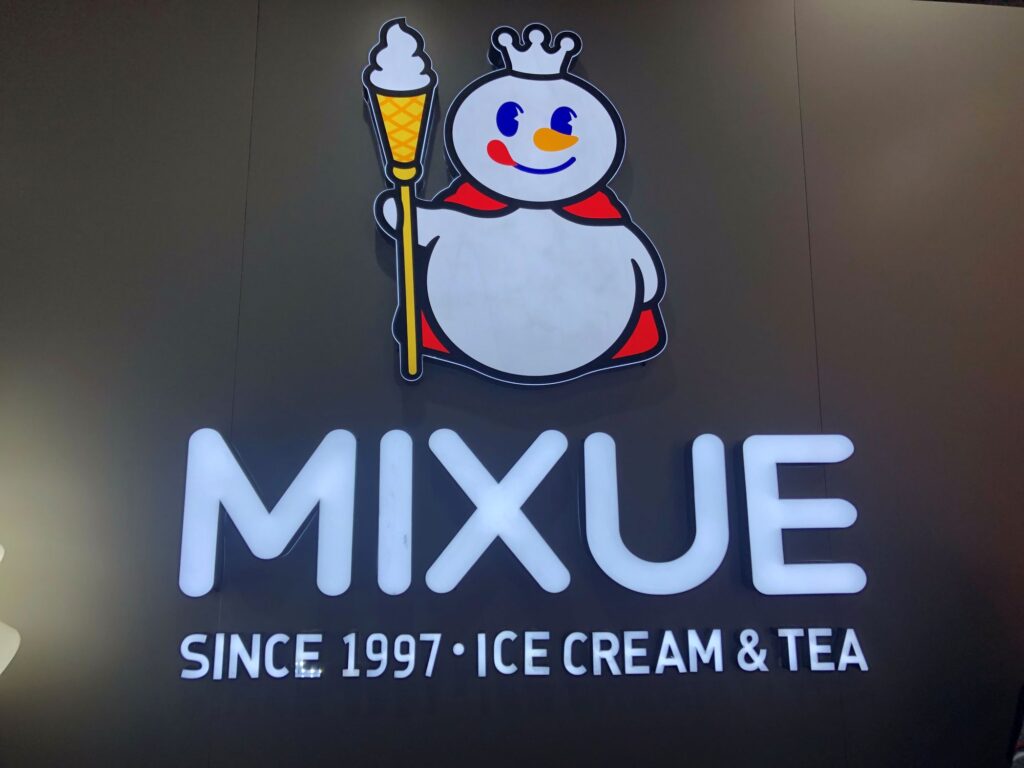 東南アジア各国にある蜜雪冰城に初めて出会ったのがこの店舗でした。今ではスターバックスの店舗数を超えたと日系新聞でも記事になるほどの会社です。中国・河南省鄭州で1997年に設立されました。中国国内に多数の店舗を持つだけでなく、東南アジア(インドネシア、ベトナム、マレーシアなど)を含めた国際展開を加速させています。アイスクリームやソフトクリーム、ミルクティー、フルーツティーなどを低価格で提供することで知られており、「庶民向け」「コスパ重視」が強みです。キャッチフレーズは「你愛我,我愛你,蜜雪冰城甜蜜蜜」というもので、この歌詞の歌が店内で繰り返し流れており耳に残ります。