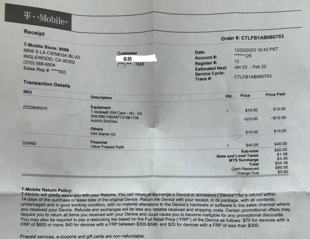 次に、スマートフォン用のSIMカードを購入しにT-Mobileへ向かいました。当時は私はまだe-SIMを使用していませんでした。LAX空港内のSIMカード販売店は観光客価格で高めに設定されていることが多いため、レンタカーがある場合は空港外の店舗で購入した方が費用を抑えられます。