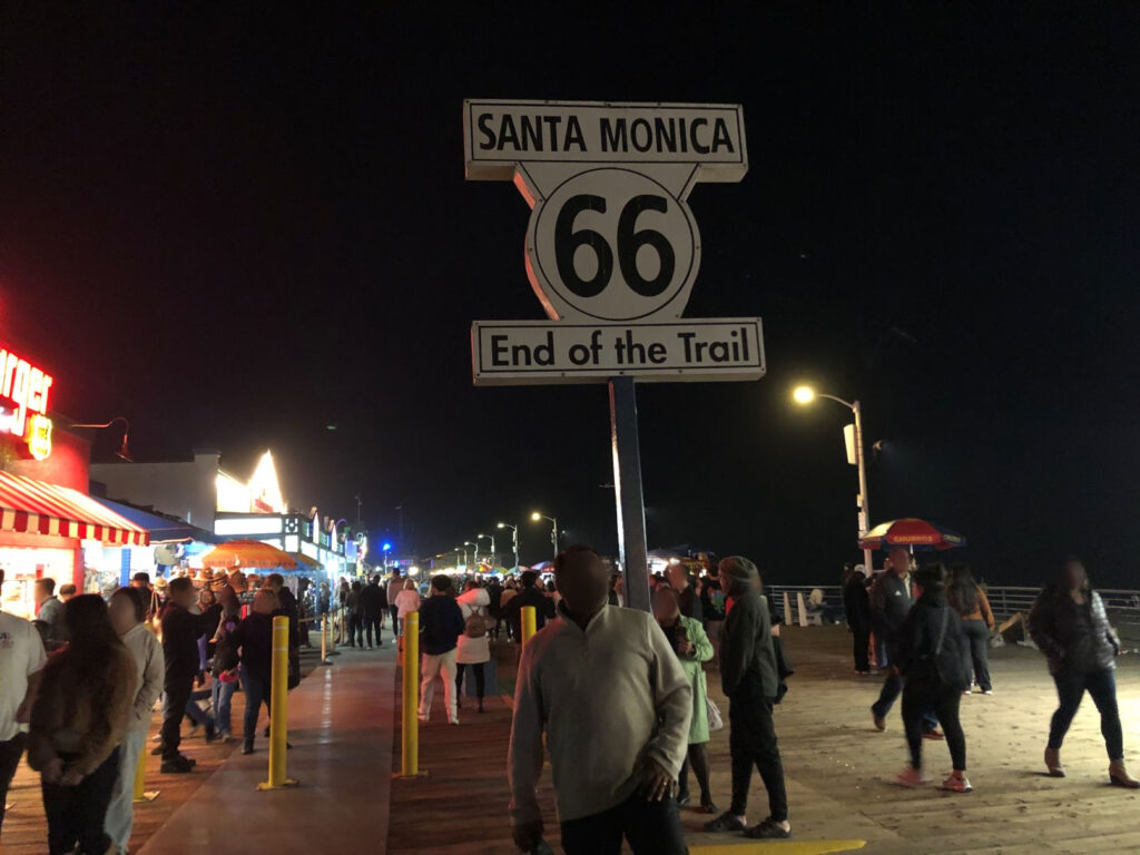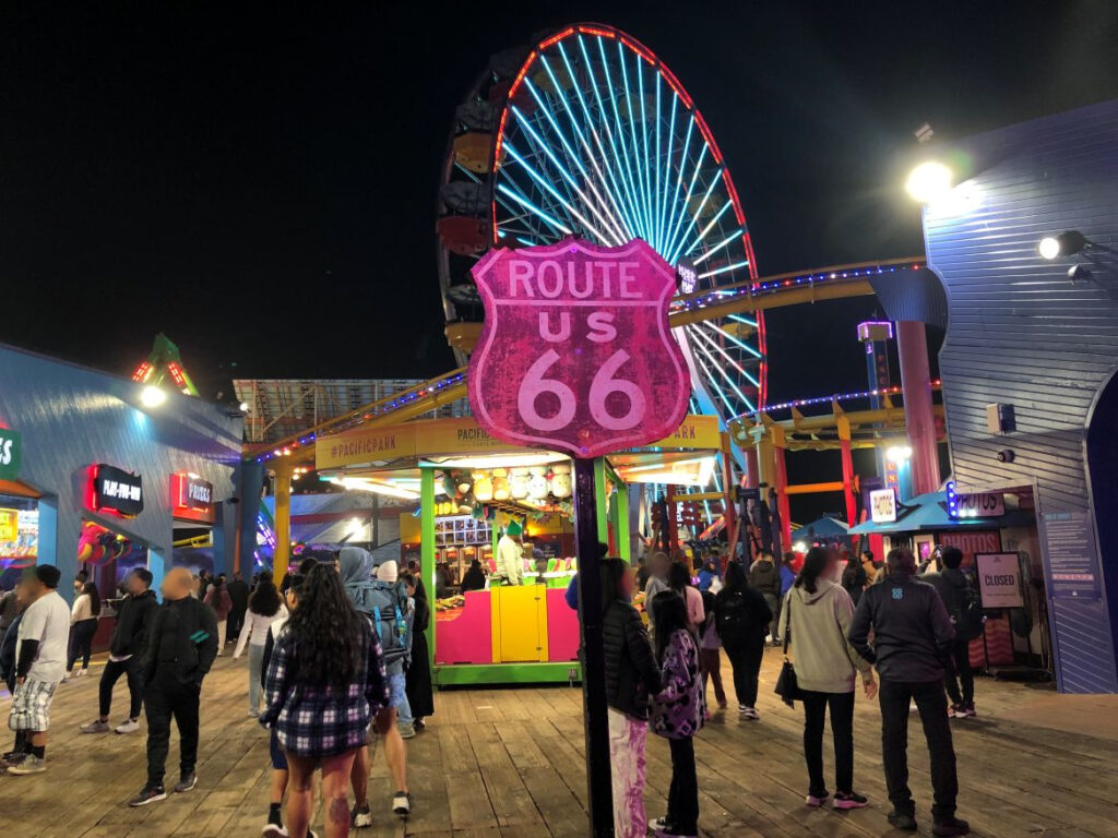 ここは歴史的に「ルート66(Route 66)」の終着点として知られています。ルート66は1926年に創設され、シカゴとサンタモニカを結ぶ約2,448マイルの重要な幹線道路でした。多くの人々が「アメリカンドリーム」を求めて西へと移動した歴史の象徴であり、サンタモニカ・ピアはその旅路の終わりの地、つまり太平洋に突き当たる場所として、多くの旅人に愛されてきました。